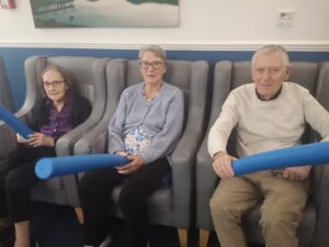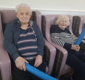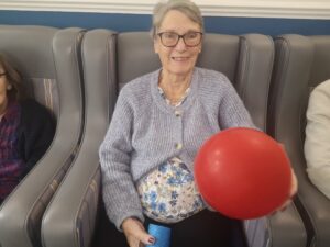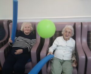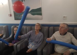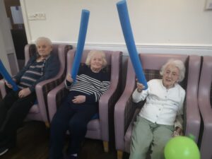 This afternoon residents enjoyed a few energising games of balloon tennis in which they had to pass the balloon along to each other using their pool noodle and making sure it doesn’t touch the ground. This inspired laughter and jokes from the residents and staff as they matched each other’s competitive spirit.