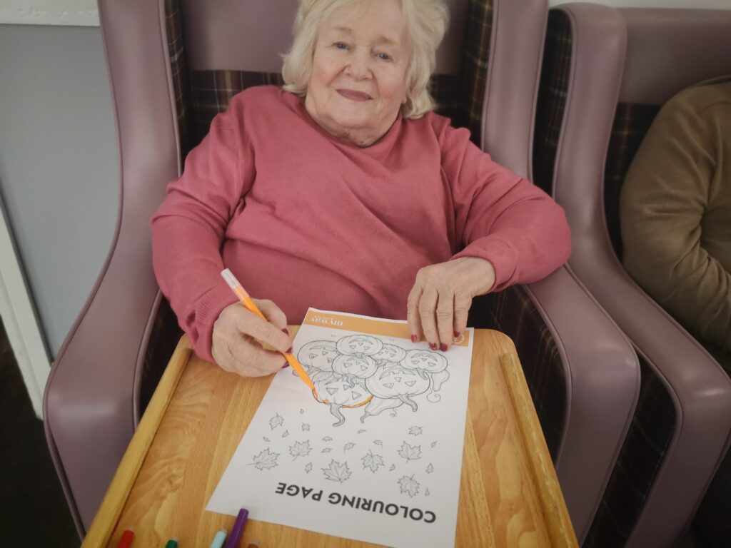 This morning residents enjoyed doing some colouring in the main lounge which was good fun. We had a lovely time colouring in different autumn and Halloween themed pictures including scarecrows, leaves and pumpkins which was very nice. We also enjoyed chatting to each other and reminiscing about our favourite hobbies and pastimes which was lovely.