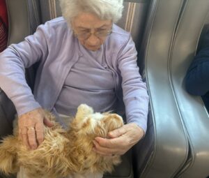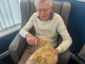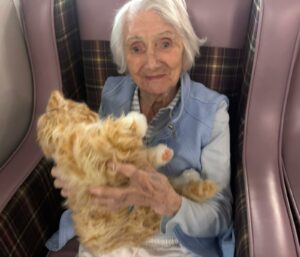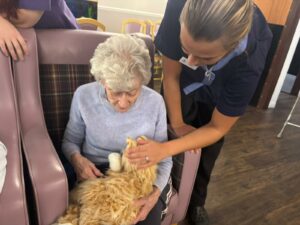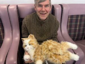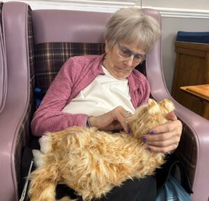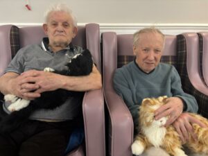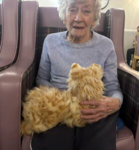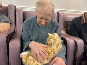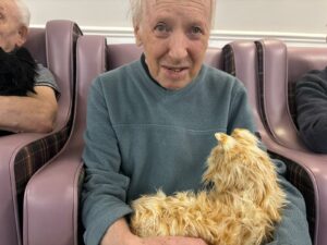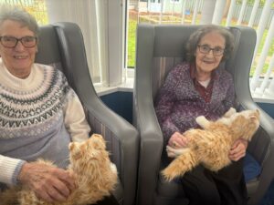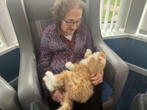 This afternoon residents enjoyed a session of cat therapy with the mechanical cats that purr and roll over as if it were real. they all enjoyed being able to stroke the cat’s soft fur and listen to them meow as they all excitedly showed each other and reminisced on past pets. A good time was had by all.