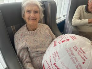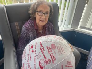 This morning residents enjoyed a few games with the memory ball in which they had to catch the ball and answer the question their hand landed on. The questions were all memory based and inspired residents and staff to reminisce on past memories that the question brought up.