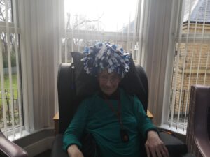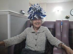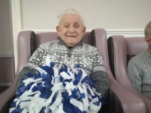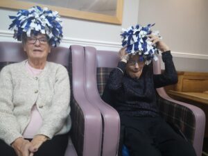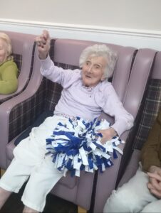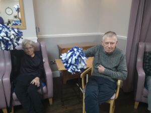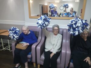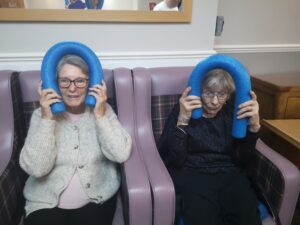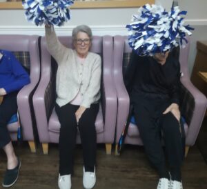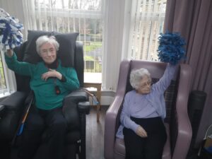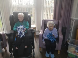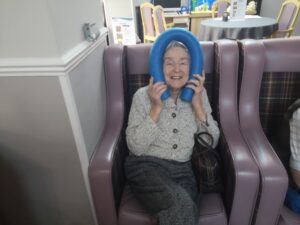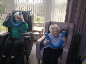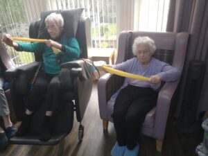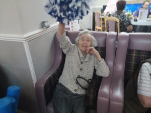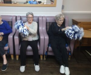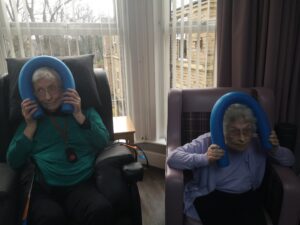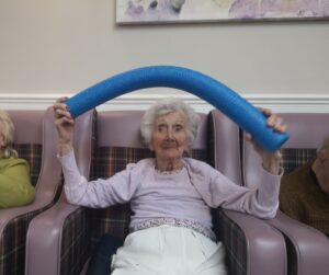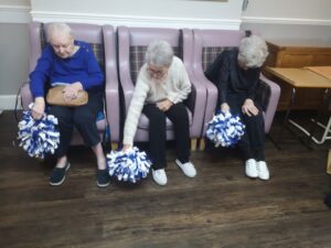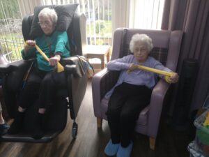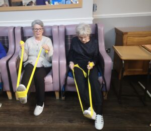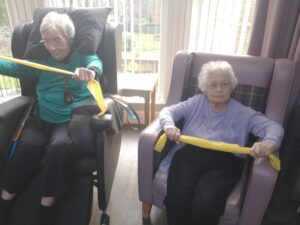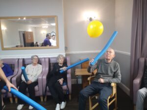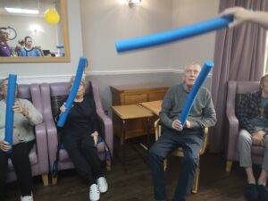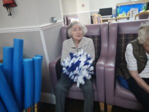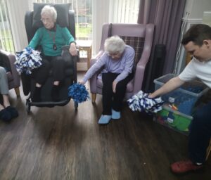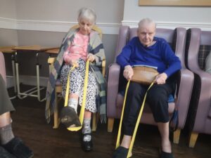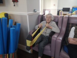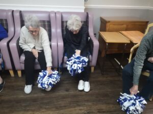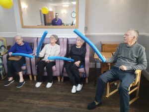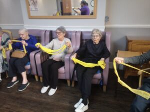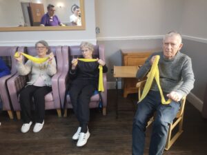 This morning residents enjoyed gathering in the main lounge for our weekly motion session with the lovely Aaron. We had a great time taking part in all the different exercises and games including equipment like yellow resistance bands, pompoms and blue waggles. We also enjoyed having a little sing a long to songs like Ilkley Moor by Tat, The Grand Old Duke of York and Row row your boat which was great fun.