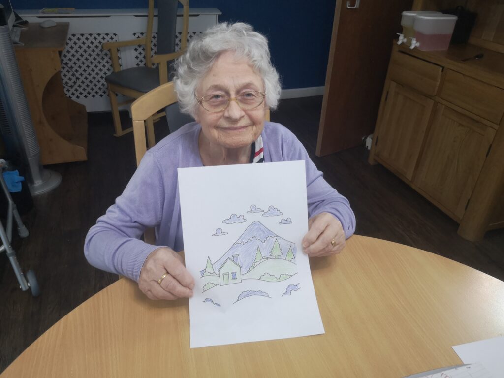 This afternoon residents enjoyed a relaxing session of arts and crafts, we printed off some landscape scenes and they got creative and coloured them in.