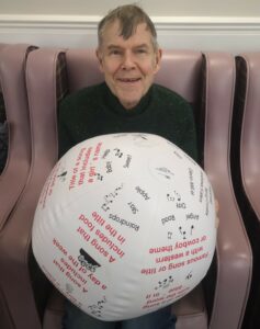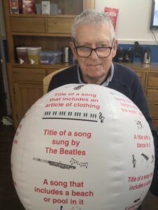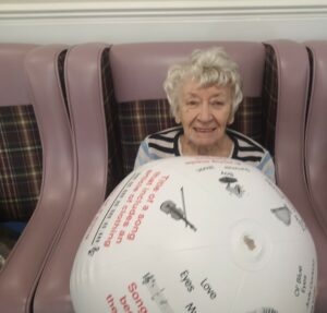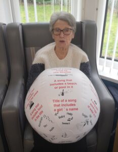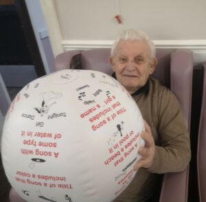 This morning residents enjoyed throwing and catching the memory ball around the room, whenever they caught it, they were asked to answer a question from it.