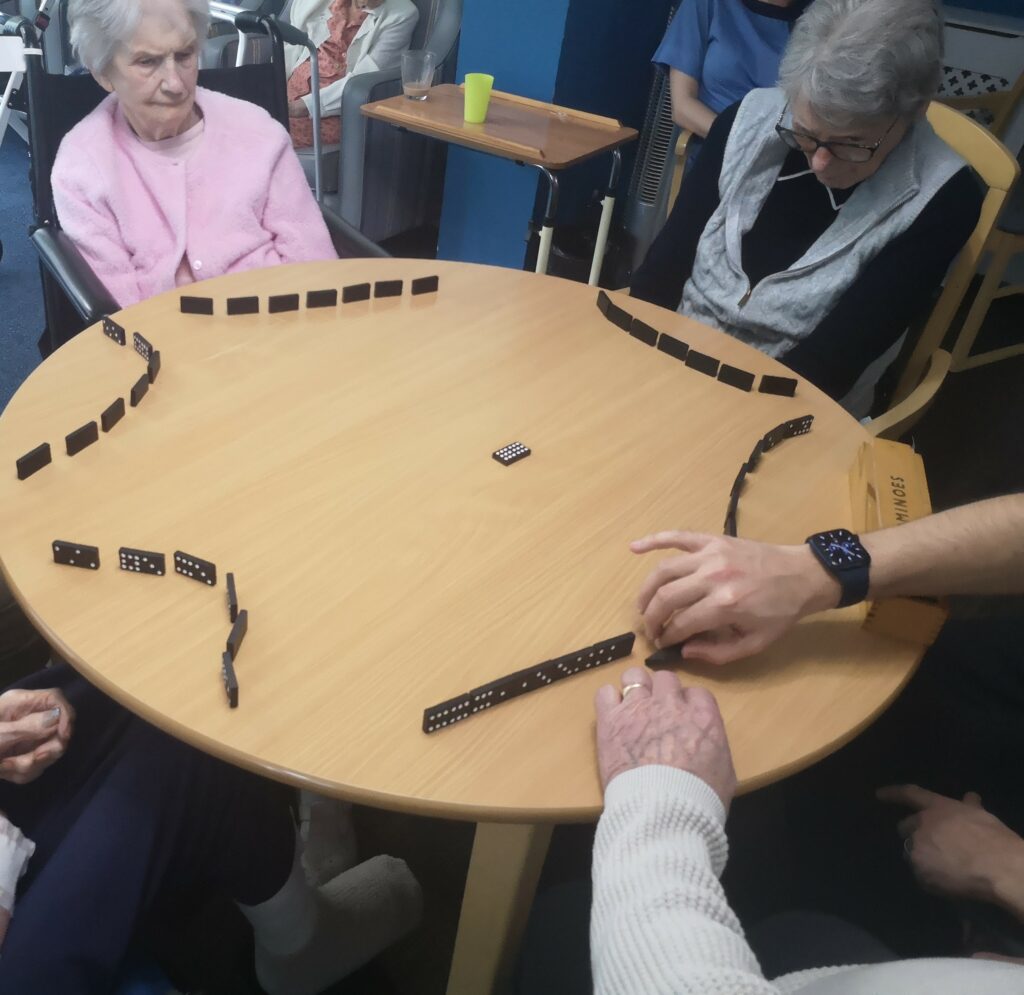 Many chose to play dominoes, whilst other watched. It was very entertaining and everyone enjoyed it with Jean and Lilian winning a game each.