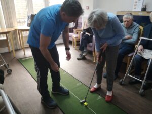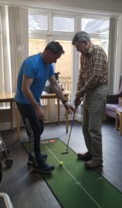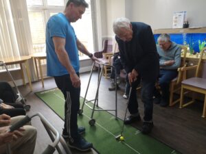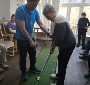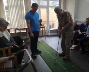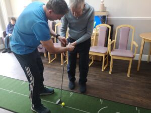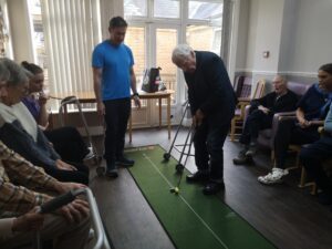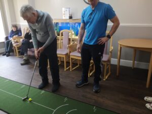 This afternoon the residents enjoyed a few games of golf with golf in society with Charles in which they played against one another and were assisted with competing. This activity inspired a fun competitive spirit as the residents raced to win the trophy. A good time was had by all.