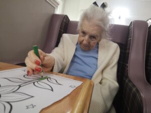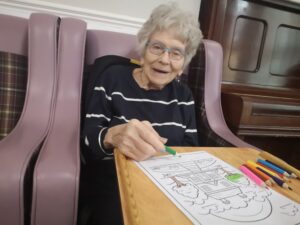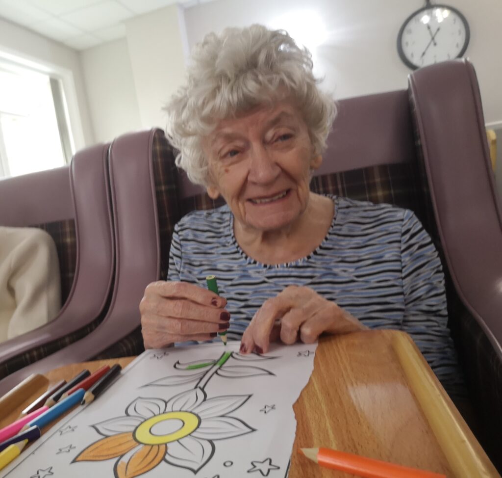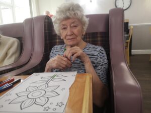 This morning residents enjoyed taking part in some colouring in the main lounge which was lovely. We had a great time colouring different pictures including flowers and houses as well as some wordsearches whilst also listening to a bit of music. This made for a nice calm and relaxing morning which everyone enjoyed.