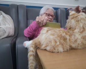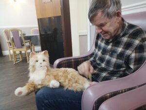 This Afternoon residents enjoyed grooming our Therapy Cat and reminiscing about passed animals they may have owned throughout the years , the most popular animals are dogs and cats but some residents had pet snakes and lizards , residents enjoyed the sensory element of stroking the cat as well as the reminiscence of all the animals they had owned