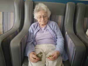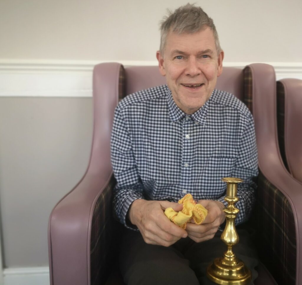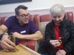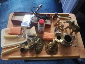 This afternoon residents enjoyed looking at our home from home box. This enjoyed a few brass ornaments, candlesticks, cutlery and even an old trouser press. Some residents even had a go at polishing them up with me. It was a lovely afternoon where we reminisced about cooking, cleaning and doing general housework with our families.