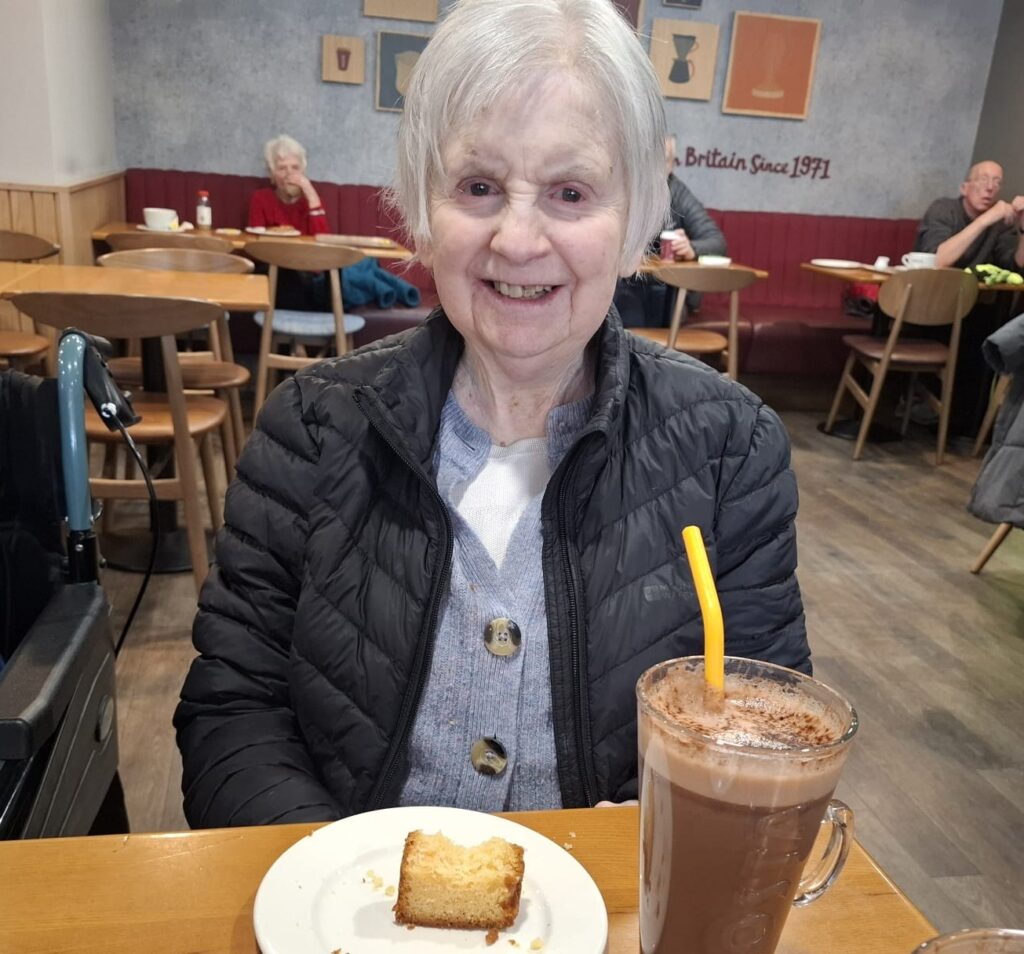 This afternoon, Wendy enjoyed a lovey trip out to costa for a nice hot chocolate and some lemon drizzle cake which she really enjoyed. We had a fantastic time chatting and reminiscing about her family life, where she used to work, previous holidays and much more which was very interesting. Wendy stated that cafes are one of her favourite places as she gets to meet new people every time she goes which she enjoys which made for a very nice afternoon.