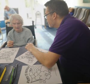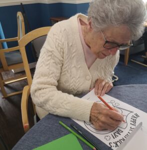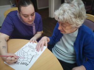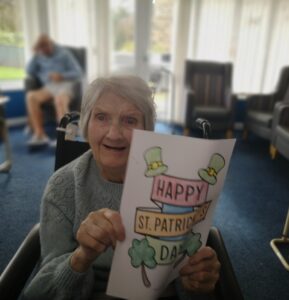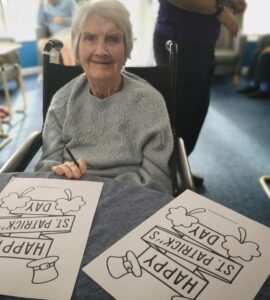 This morning the residents participated in a relaxing session of St Patricks day themed crafting in which they coloured in shamrocks and various pictured and made a lovely green paper chain to be used as decoration at tomorrow’s party while reminiscing on their past experiences surrounding the day. A good time was had by all.