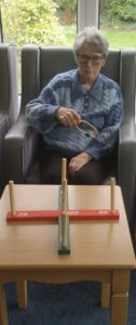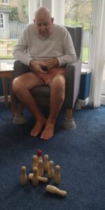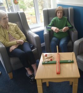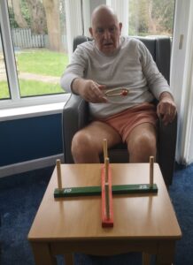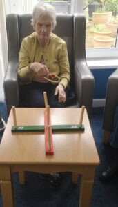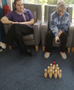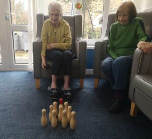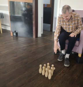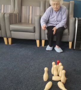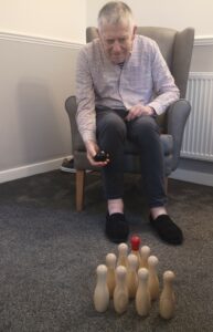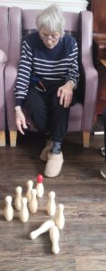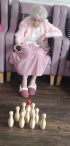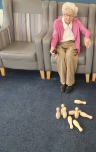 This morning residents enjoyed having a go at a few active games. We chose to play some indoor bowling, we set the skittles up in front of them and they took it in turns to see how many they could knock down. This was great fun and sparked a bit of friendly competition.