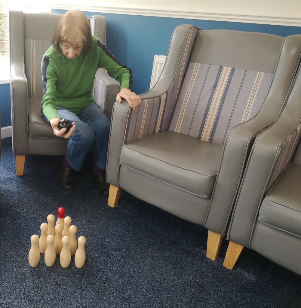 This morning residents enjoyed having a go at a few active games. We chose to play some indoor bowling, we set the skittles up in front of them and they took it in turns to see how many they could knock down. This was great fun and sparked a bit of friendly competition.