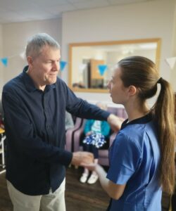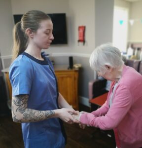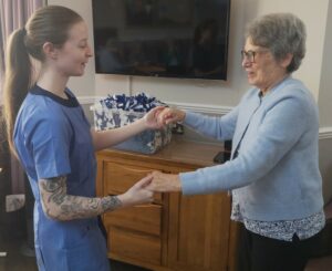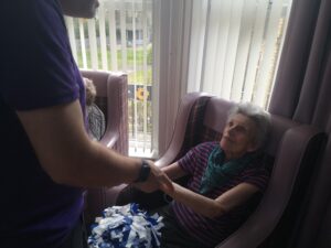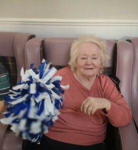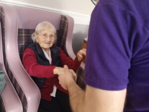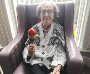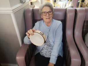 This morning residents enjoyed a dance and movement session in the main lounge. We got the blue tooth speaker out and picked some of our favourite songs, we then handed out some musical instruments and pom poms and sang and danced away together.
