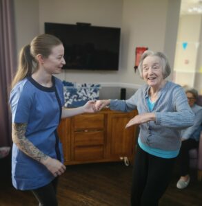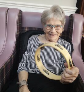 This morning residents enjoyed a dance and movement session in the main lounge. We got the blue tooth speaker out and picked some of our favourite songs, we then handed out some musical instruments and pom poms and sang and danced away together.