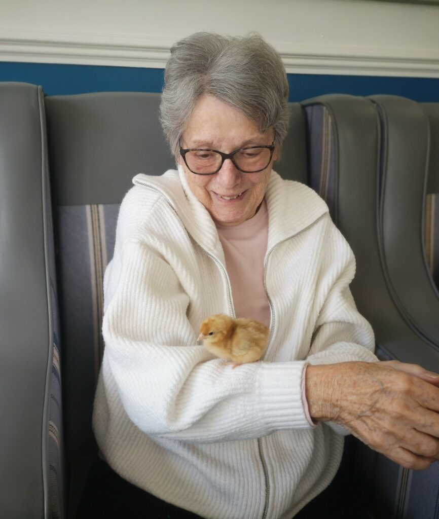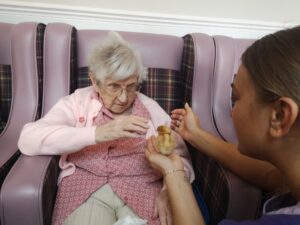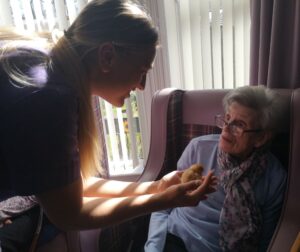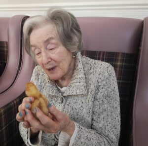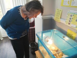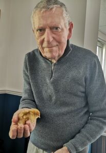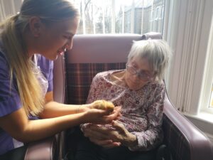 This afternoon staff took some of the newly hatched chicks around to show residents, we enjoyed holding and stroking them, some residents just wanted to look at them in their hutch. This was a really lovely session and we all can’t wait to see them again very soon.