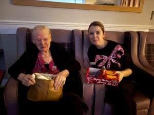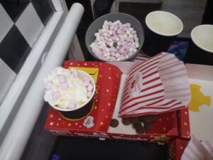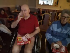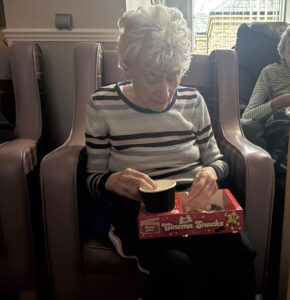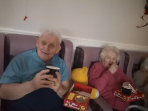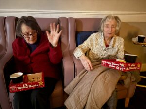 This afternoon residents enjoyed watching the most famous Christmas film, Home Alone, in the main lounge for our Christmas cinema experience. We had a fantastic time watching this classic festive movie on a big projector screen. We also enjoyed some lovely cinema snack boxes with hot chocolate with cream and marshmallows, popcorn and a variety of chocolate which was very nice and made the experience that little bit more special. This was a wonderful afternoon which got us all nice and relaxed ready for Christmas morning.